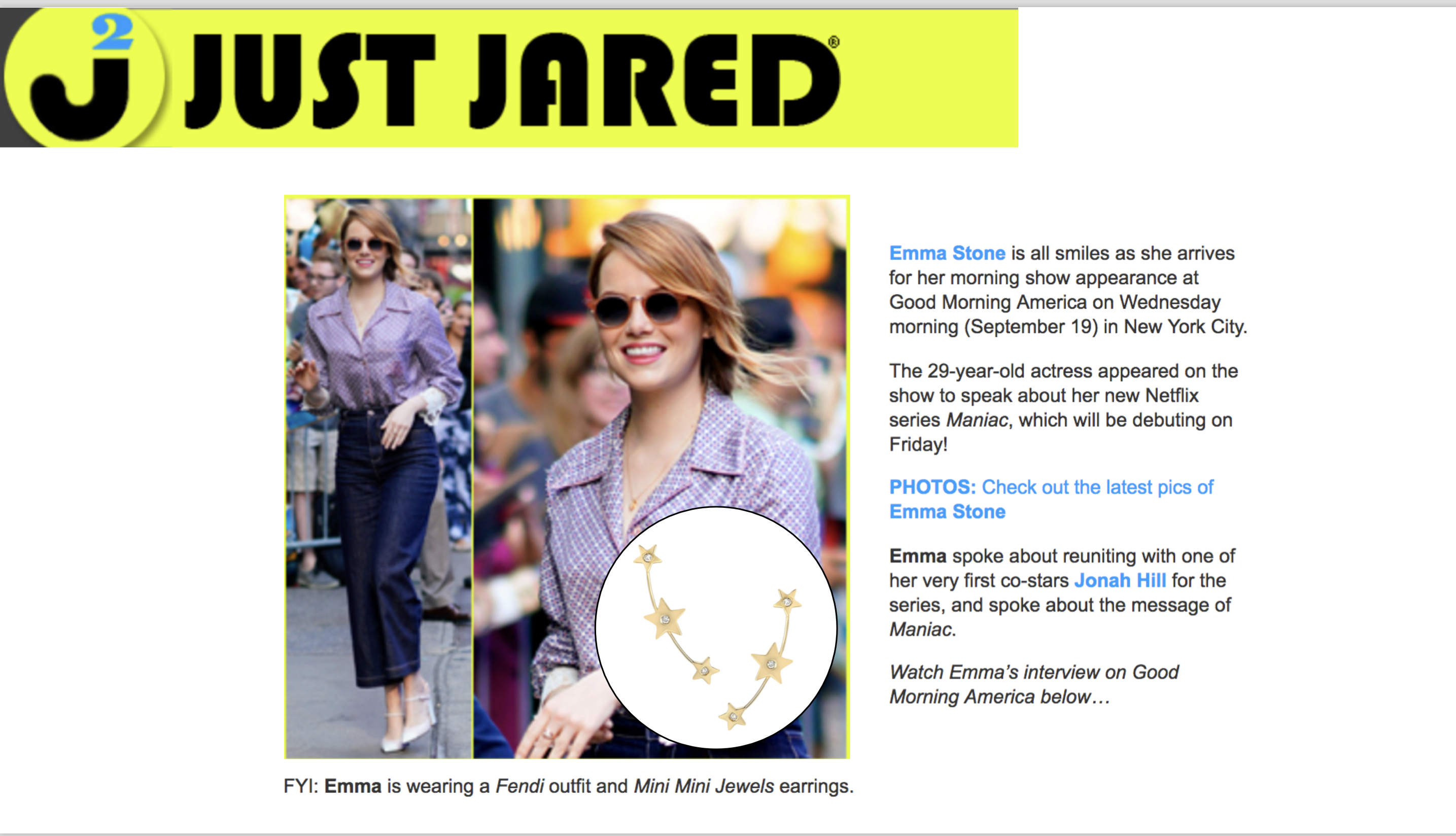 Emma Stone Wearing her Mini Mini Jewels Diamond and Gold Triple Star Ear Crawler on her way to